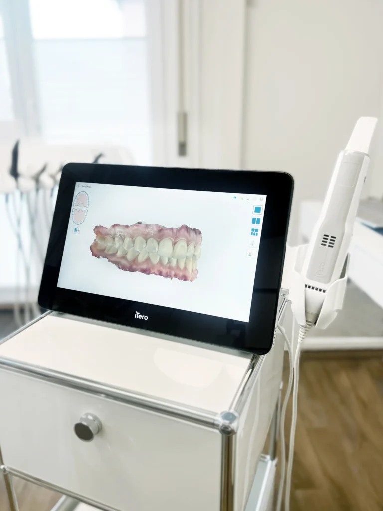 ONLINE TERMIN ONLINE TERMIN Invisalign – die durchsichtige Zahnspange: So funktioniert das digitale Premium-Aligner-System (iTero + ClinCheck) Wenn es um moderne Kieferorthopädie geht, entscheiden sich immer mehr Patientinnen und Patienten für eine durchsichtige Zahnspange wie Invisalign. Und wie man so schön sagt: So viele Menschen können sich nicht irren – insbesondere dann nicht, wenn die fachlichen und technologischen Argumente eindeutig dafürsprechen.Erfahren Sie, wie das Premium-Aligner-System funktioniert und warum es sich lohnt, ausschliesslich auf das Original zu setzen. Mehr über unsere Arbeitsweise und unseren Qualitätsanspruch erfahren Sie auf der Seite Unsere Praxis Inhaltsverzeichnis Vorteile der modernen Kieferorthopädie Transparente Invisalign Aligner, die die Zähne Schritt für Schritt korrigieren. Eine Zahnspange wird häufig als rein ästhetische Behandlung wahrgenommen, tatsächlich geht es jedoch um deutlich mehr. Neben einem harmonischen Lächeln spielen Funktion, Bissstabilität und langfristige Mundgesundheit eine zentrale Rolle.Eine korrekt ausgerichtete Zahnstellung erleichtert die Zahnpflege, kann Fehlbelastungen reduzieren und wirkt sich positiv auf die Lebensqualität aus. Vorbehalte gegenüber Zahnspangen sind heute weitgehend überholt. Moderne Systeme wie durchsichtige Zahnspangen durchsichtig konzipierte Aligner bieten sowohl hohen Tragekomfort als auch eine nahezu unsichtbare Optik. Warum ist Invisalign eine gute Wahl? Die Vorteile lassen sich klar zusammenfassen:unsichtbar, komfortabel, individuell geplant und effizient. Unsichtbar Ein häufiger Kritikpunkt an klassischen Zahnspangen ist die sichtbare Beeinträchtigung der Ästhetik. Auch wenn moderne feste Apparaturen heute ästhetischer gestaltet sind, gilt Invisalign als klare Zahnspange, die im Alltag kaum auffällt. Die durchsichtige Zahnspange fügt sich dezent in das Erscheinungsbild ein. Komfortabel und individuell Die transparenten Aligner werden präzise an die Zahnform angepasst. Sie liegen exakt an, reizen weder Zahnfleisch noch Mundschleimhaut und lassen sich zum Essen sowie zur Zahnpflege problemlos herausnehmen. Für ein optimales Ergebnis ist es notwendig, die Aligner täglich etwa 20 bis 22 Stunden zu tragen. Effizient Jede einzelne durchsichtige Zahnspange übernimmt eine exakt definierte Zahnbewegung. Durch die vollständig digitale Planung kann die Behandlung mit einer transparenten Zahnspange in vielen Fällen effizienter und zeitsparender erfolgen als mit herkömmlichen Systemen. Invisalign – Ablauf der Behandlung Digitaler Ablauf einer Invisalign Behandlung – vom iTero Scan bis zum fertigen Lächeln. Schritt 1 – iTero Scan Die Behandlung beginnt mit einem digitalen Abdruck mittels iTero-Scanner. Das System greift auf eine umfangreiche Datenbank mit mehreren Millionen dokumentierten Invisalign-Fällen zurück.Unmittelbar nach dem Scan wird eine realistische 3D-Visualisierung des möglichen Behandlungsergebnisses inklusive einer ersten Zeit- und Kostenabschätzung erstellt. Schritt 2 – Digitale Planung der Zahnbewegung Im nächsten Schritt erfolgt die detaillierte Planung der individuellen Zahnbewegung. Das dreidimensionale Modell zeigt exakt, welche Zähne durch welche durchsichtige Zahnspange bewegt werden und wie sich die Zahnstellung schrittweise verändert.Erste sichtbare Veränderungen können bereits nach wenigen Wochen auftreten. Schritt 3 – Herstellung der Aligner Basierend auf der digitalen Planung werden sämtliche für die Behandlung erforderlichen Aligner gefertigt. Abhängig von der Ausgangssituation können zusätzliche Hilfsmittel wie Attachments oder interdentale Schmelzreduktion notwendig sein.Nach der Übergabe der Aligner beginnt die aktive Behandlungsphase mit der transparenten Zahnspange. Schritt 4 – Digitale Verlaufskontrolle mit ClinCheck Ein wesentlicher Vorteil von Invisalign ist die gute Integration in den Alltag. Kontrolltermine sind in der Regel nur alle vier bis acht Wochen erforderlich.Über die digitale Verlaufskontrolle mittels ClinCheck können Patientinnen und Patienten regelmässig Fotos ihrer Zähne übermitteln. Dadurch ist eine kontinuierliche Fernüberwachung des Behandlungsverlaufs möglich, und der behandelnde Zahnarzt kann bei Bedarf frühzeitig eingreifen. Für persönliche Beratung oder Rückfragen erreichen Sie uns jederzeit überKontakt: https://dentique-zahnarztpraxis.ch/kontakt/ Schritt 5 – Abschluss der Behandlung Der Abschluss der Behandlung stellt einen entscheidenden Moment dar, da nun das vollständige Ergebnis sichtbar wird. Invisalign steht dabei nicht für eine langwierige oder belastende Therapie, sondern für einen strukturierten, modernen und insgesamt sehr komfortablen Behandlungsprozess.Zur langfristigen Stabilisierung der Zahnstellung werden im Anschluss ein festsitzender Retainer sowie eine Nachtschiene eingesetzt. Diese Lösungen bieten einen vergleichbaren Tragekomfort wie die durchsichtigen Zahnspangen selbst. Digitaler Zahnscan mit iTero zur Planung einer Invisalign Behandlung Warum sollte man keine Kopien wählen? Der Erfolg von Invisalign hat zahlreiche Nachahmer hervorgebracht. Auch wenn diese Systeme auf den ersten Blick ähnlich erscheinen, fehlt es ihnen häufig an der wissenschaftlichen Grundlage, der digitalen Infrastruktur und der langjährigen klinischen Erfahrung.Invisalign steht für kontinuierliche Forschung, hochwertige Materialien und die Auswertung von Millionen erfolgreich abgeschlossener Behandlungen weltweit. Dieser Qualitätsstandard lässt sich durch Kopien nicht ersetzen. Zusammenfassung Invisalign ist weit mehr als eine einfache transparente Zahnspange gestaltet. Es handelt sich um ein umfassendes, digitales Behandlungskonzept, das Präzision, Komfort und Ästhetik vereint.Die Kombination aus iTero-Scan, dreidimensionaler Behandlungsplanung, digitaler Verlaufskontrolle und individuell gefertigten Alignern macht Invisalign zu einer der fortschrittlichsten Lösungen de